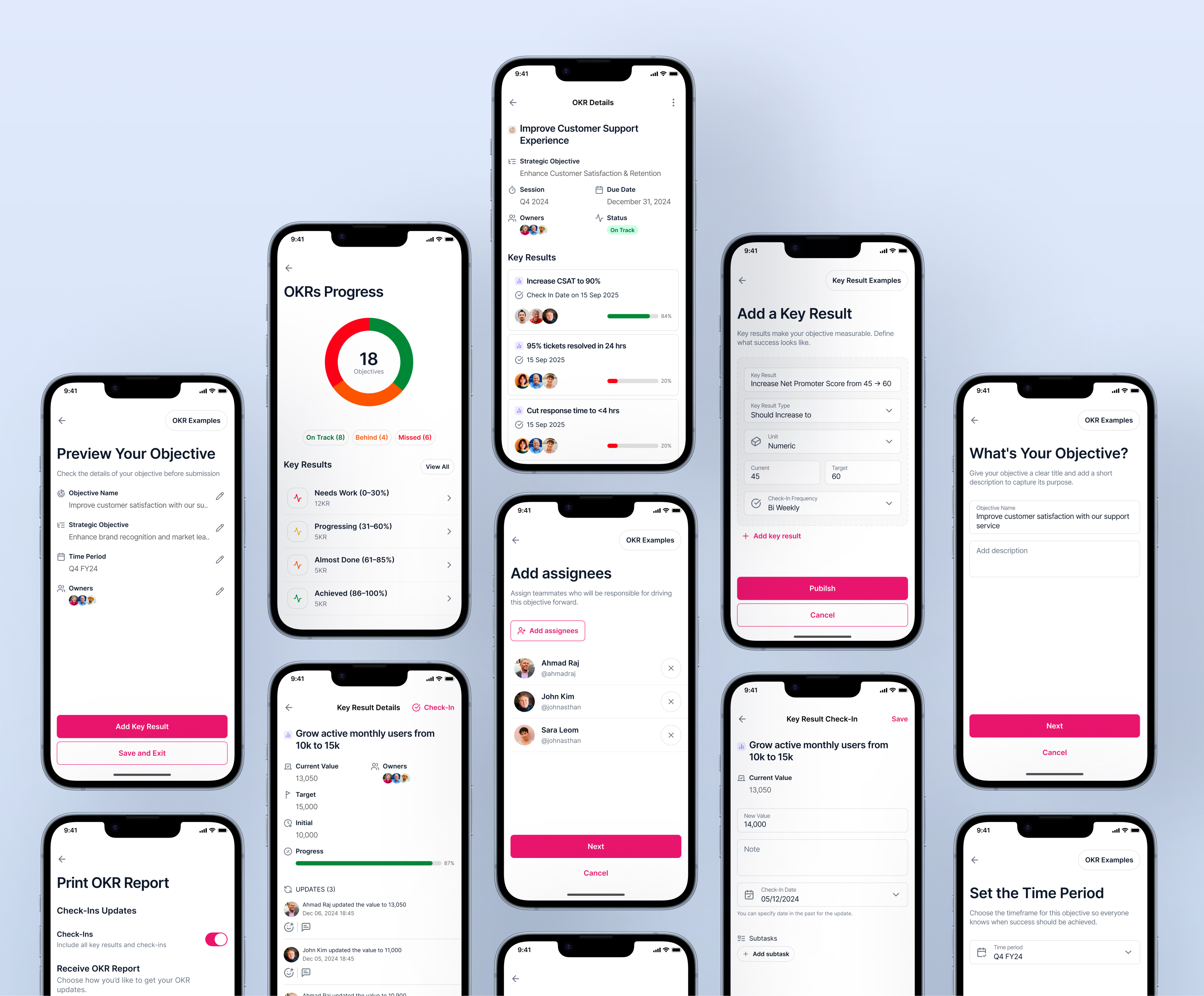 I worked closely with the product manager to understand the core problem and explore how an OKR system could address it. Through my research and analysis, I identified several key pain points: